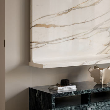 Formidable marble forms form focal points within the space - visual anchors, complementing the natural tonality of materials, these elements add boldness and grandeur.